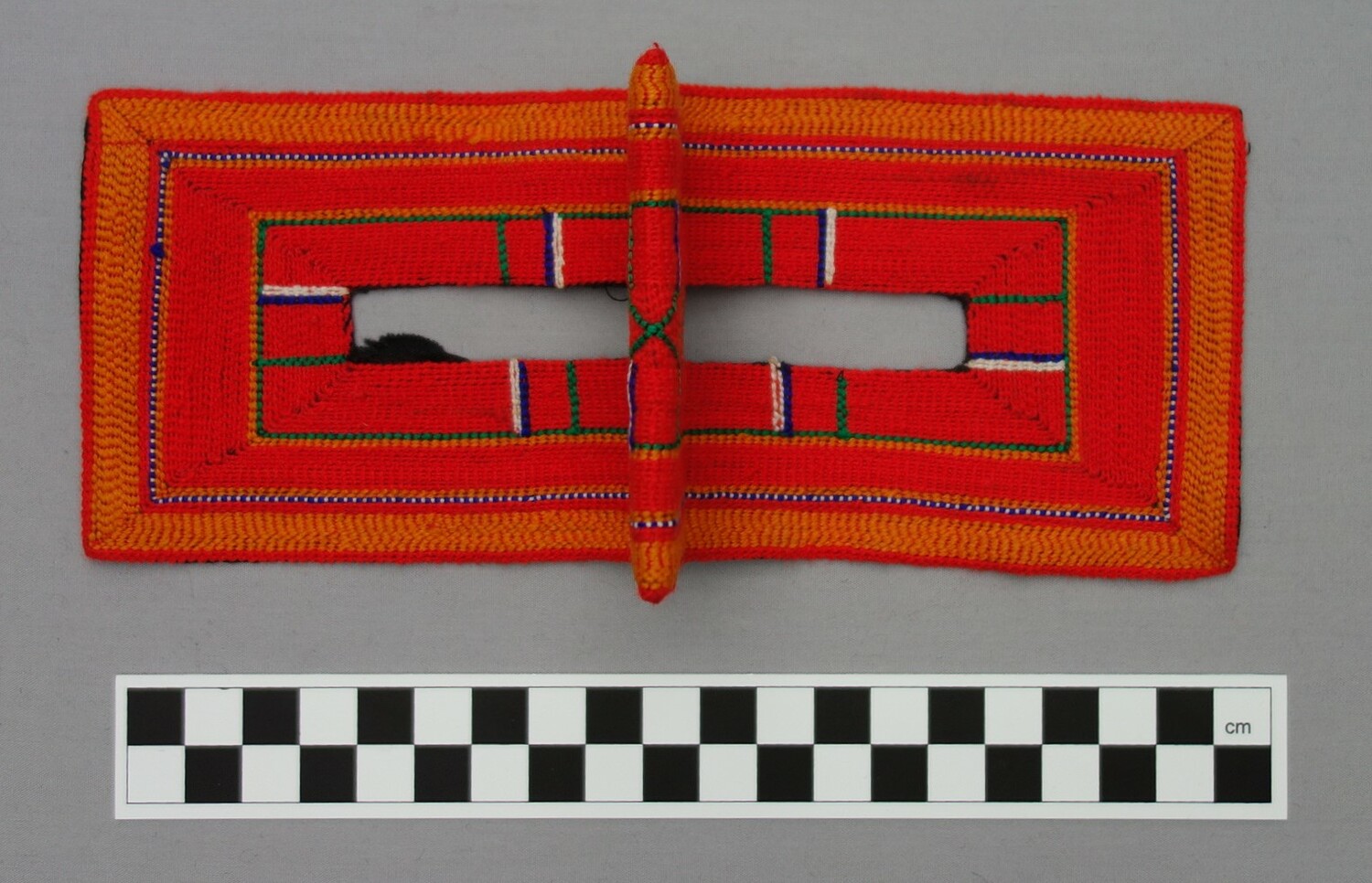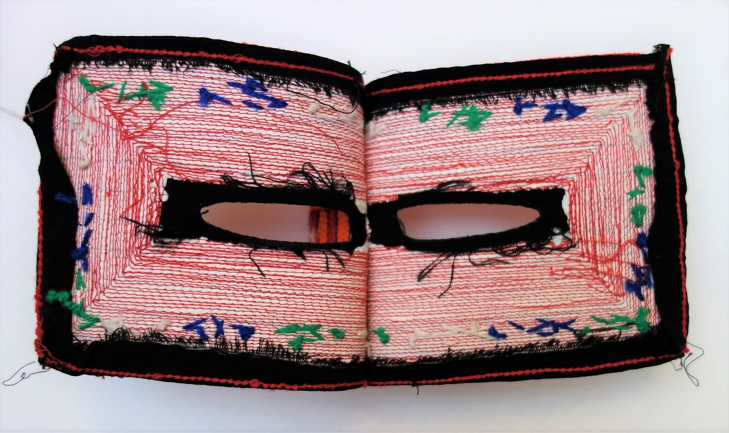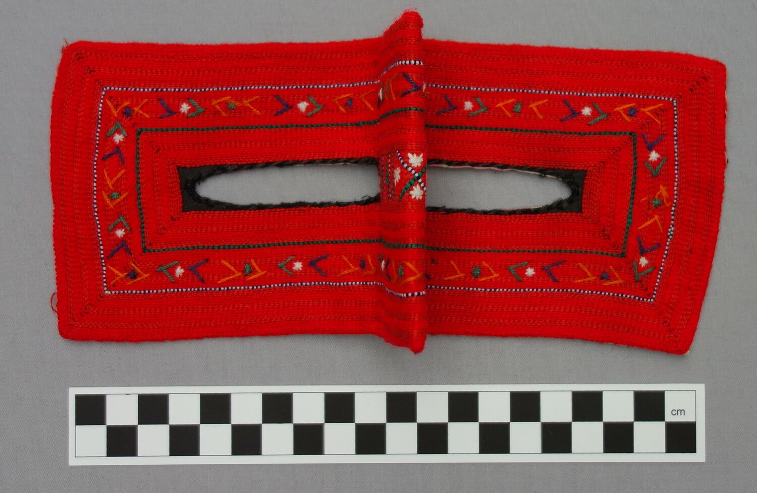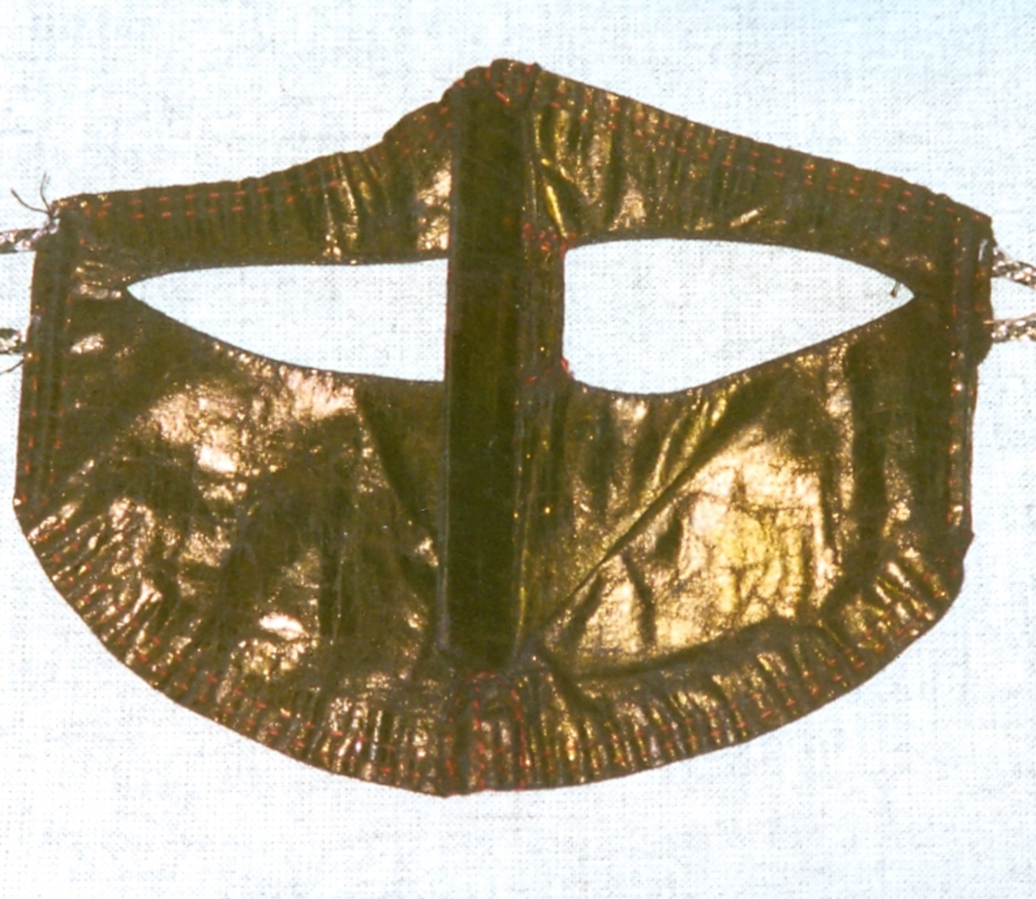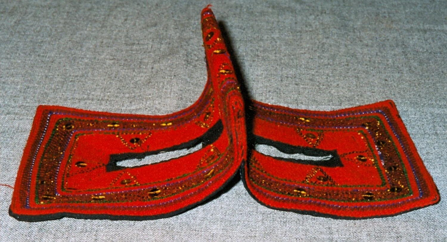 Perhaps one of the most widely known aspects of Bandar dress are the various types of face coverings. The type of face veil worn by a Bandar woman depends in the main on three factors, namely (a) her religious background (Sunni or Shi`ite), (b) her ethnic origins, and (c) where she lives. Many Shi`ite women in the Bandar region, for example, wear bright red, rectangular masks of the battulah construction that only covers the part of the face around the eyes, locally known as a burqa`, and decorated with various patterns. Originally these were hand worked, but nowadays most are decorated using machine embroidery. The colour and designs provide information as to which ethnic group the wearer derives from. Sunni women of Arab origin in the Bandar region sometimes wear a type of battulah. The main form of battulah that they use is squarish and rather long in shape. It is made out of black cotton or black velvet, or cotton cloth smeared with indigo and then polished until it adopts a golden hue. This golden coloured type of (Sunni) veil is similar to that worn in parts of Qatar, on the other side of the Persian Gulf.
