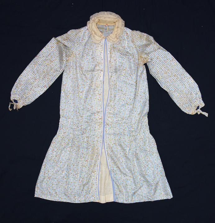 There is also a wedding dress (TRC 2020.3882) that was worn on 26 September 1926 by Giuseppina Mondelli (1900-1980), born in Sannicandro, a small village close to Bari in southern Italy. It is made of silk, cream coloured, and decorated down the front with similarly coloured lace with a stylised floral motif.