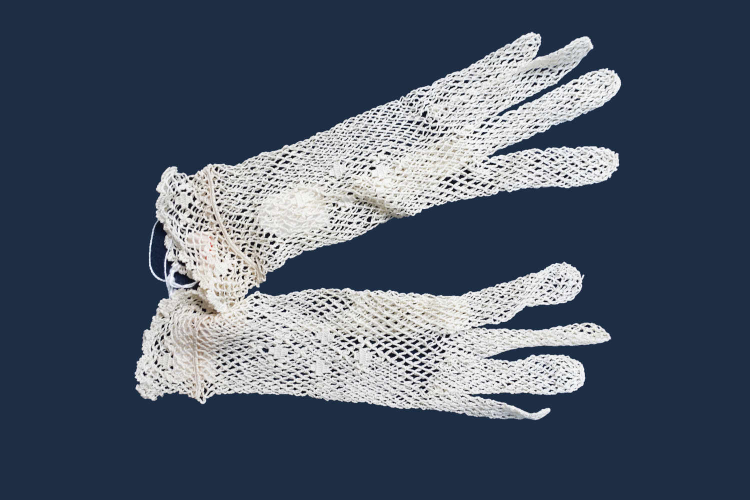 Pair of white, crochet gloves decorated with small, geometric blocks. The Netherlands, early 20th century. TRC 2015.0679a-b.Two afternoon dresses in the Collection (TRC 2022.2989 and TRC 2022.2990) come from a Dutch family (from Leiden), members of which lived in Indonesia in the 1920s. The woman who owned them, Thecia Velsing-Caspari, was married to an assistant-resident in the former Dutch East Indies.