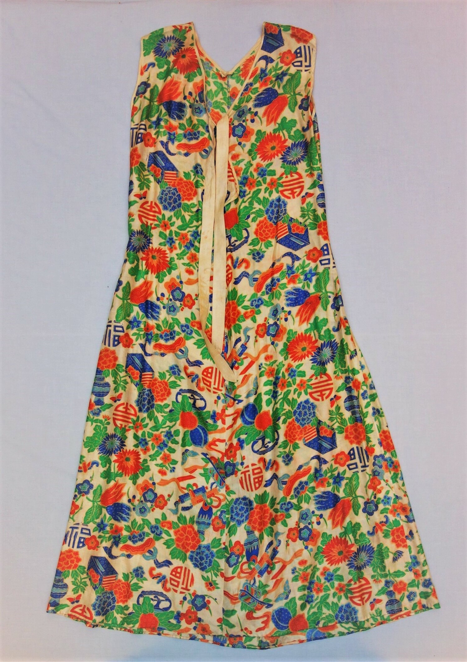 A sleeveless, ankle-length, unfitted 1920's dress, made out of a silk fabric with an Oriental pattern (floral; Chinese prosperity symbols) in green, blue, orange and red on an off-white background. The Netherlands, 1920s. TRC 2016.2301.Orientalism