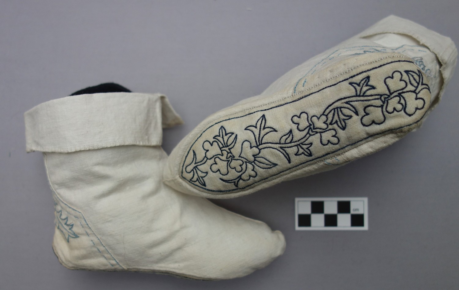 The shoes were sometimes worn with embroidered socks, which were worn during the day. They were usually made from either silk or white cotton and decorated with simple embroidery, usually with a simple floral or geometric design. The importance of socks can be seen by the fact that sixteen pairs of socks with raised and pointed toes and six pairs of shoes were found in the tomb of Huang Sheng (1227-1243) in Fuzhous, Fujian. Madame Zhou (1240-1274) had six pairs of shoes and six pairs of socks in her tomb at De’an Jiangxi.