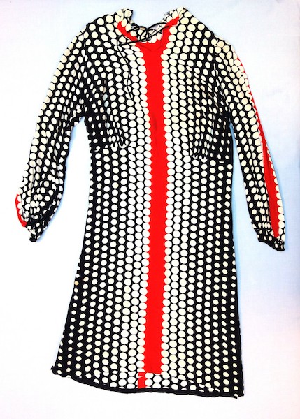 Art Deco with its simplified geometric shapes was very present in 1920s architecture, but also made its way into fashion by influencing printed textiles, especially in the latter part of the decade. Examples of this interest in contrasting geometric patterns and colours can be seen in samples of fabric in a black and red, printed polka dot dress, but also in small bags (TRC 2021.2368).