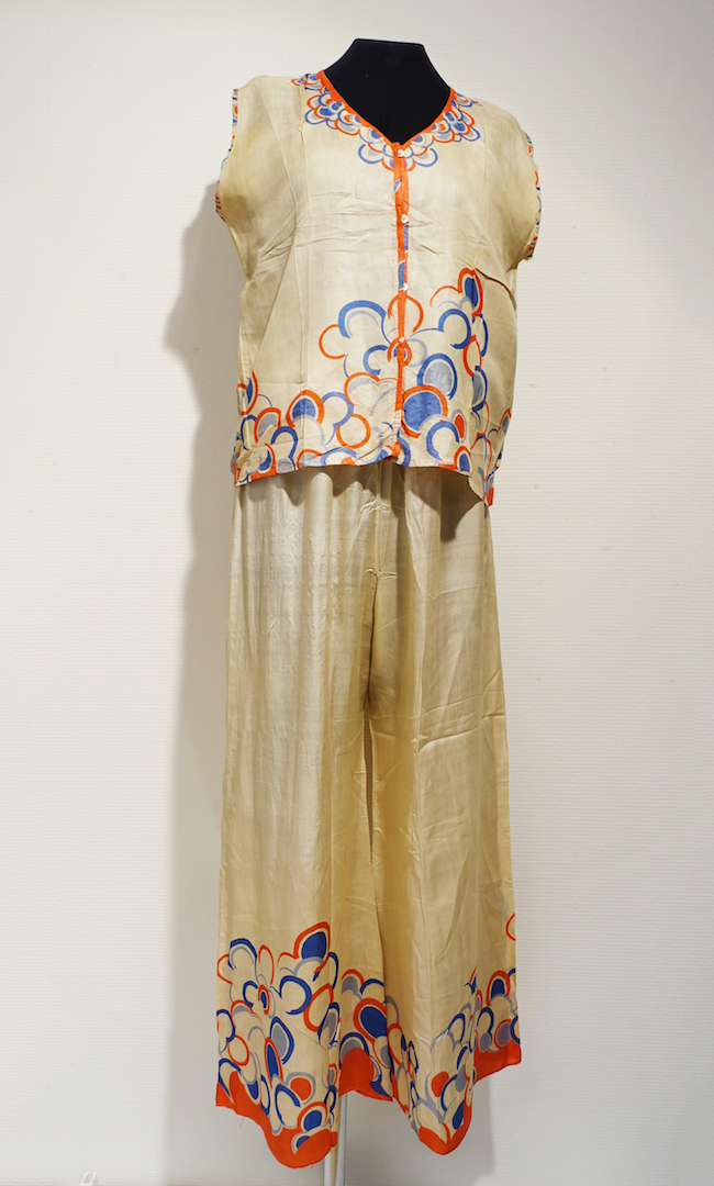 Not only were these pyjamas seen as an indoor item to sleep in, but they also became a daily outfit to be worn outside. Made out of silk, cotton or other materials, these pyjamas made a statement and reflected on similar influences as their daily counterpart pieces. See for example the bright colours and geometric patterns of the TRC 2007.0964 remind us of the Art Deco influences of the time. Similarly, the cuffs and neckline on TRC 2007.0820 are reminiscent of men's wear, and the buttons are in a Chinese style, showing the wide influence Asia had on fashion at the time.