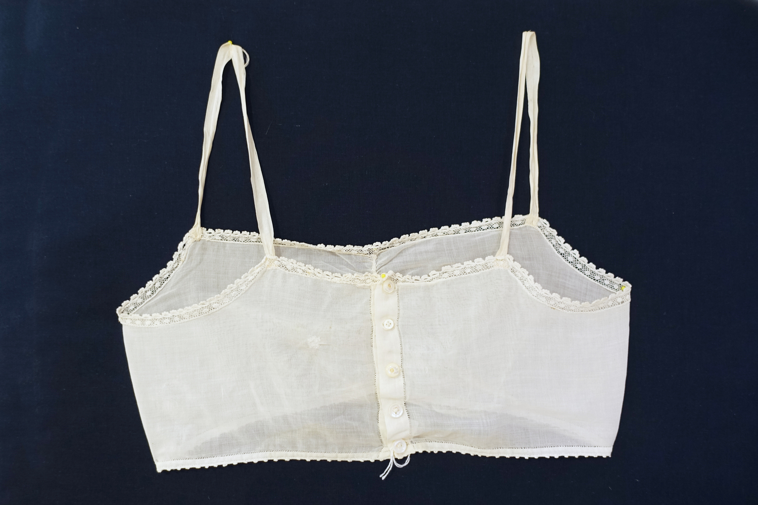 White cotton bandeau bra with shoulder straps. Slovenia, 1920s. TRC 2021.0482.Corsets, while still in use especially by older women, were designed to flatten hips and thighs rather than the waist. These low corsets (or more accurately, girdles), were worn on top of slips and often had garter belts to fasten stockings. Thus, a woman’s body could be flattened into the desirable and fashionable boyish figure.