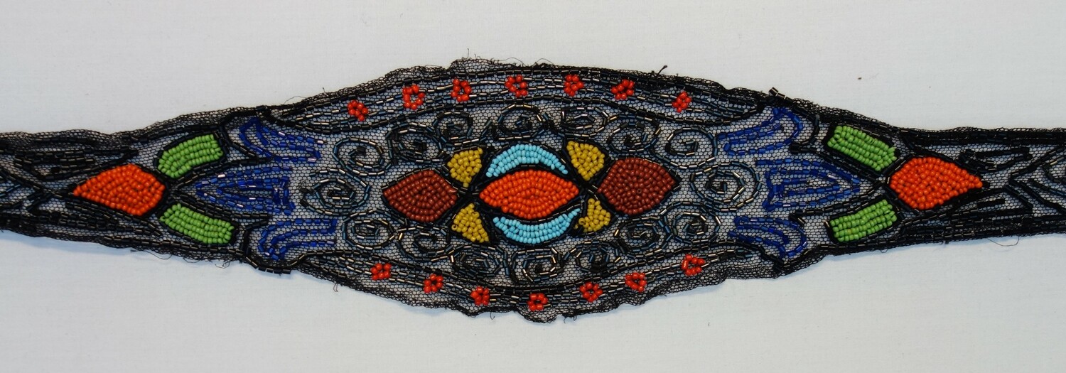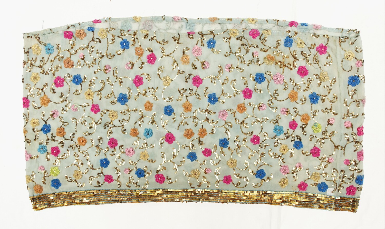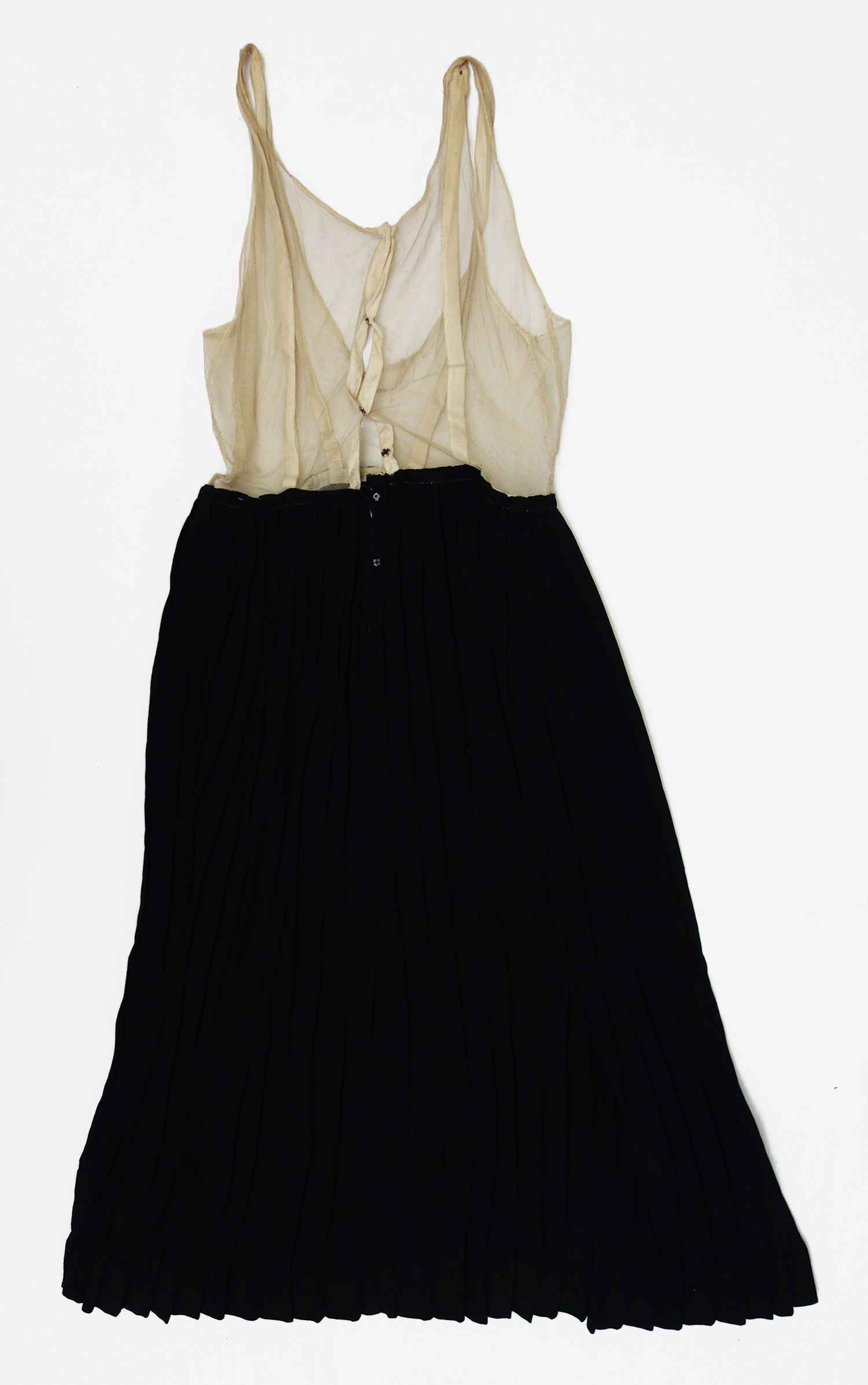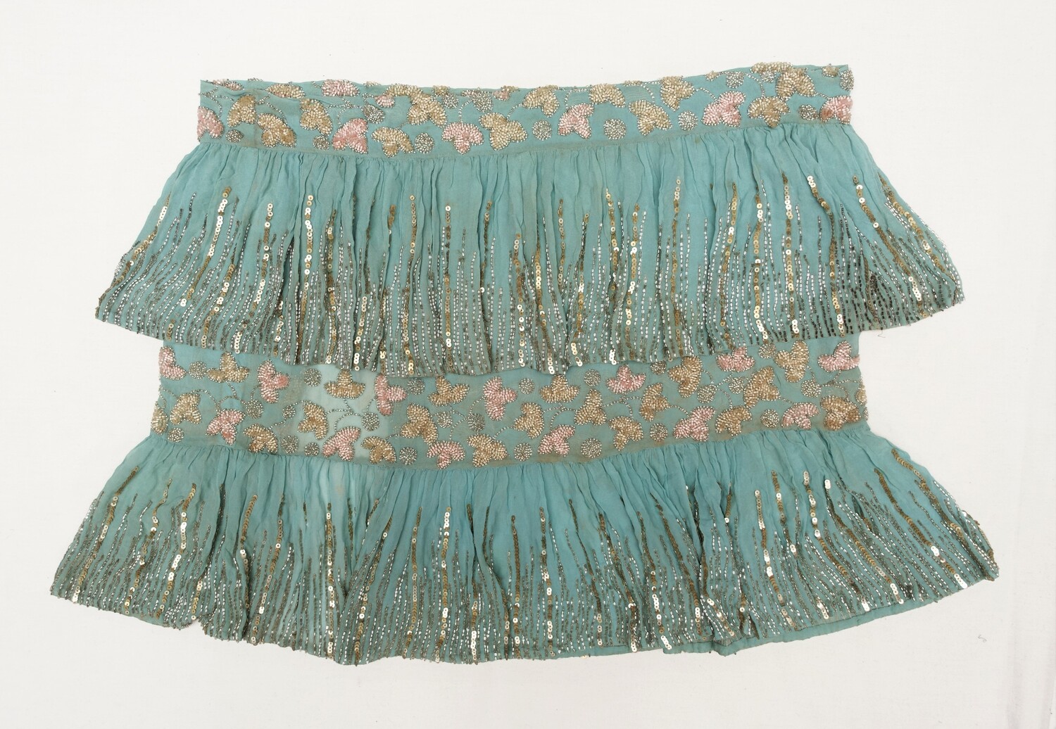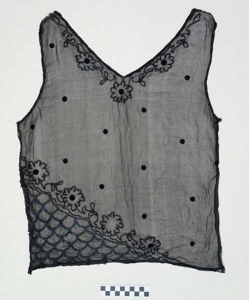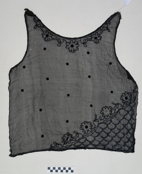 A woman's sleeveless dress in black chiffon that is decorated around the bodice area. The Netherlands, 1920s. TRC 2013.0075.As with daily wear, accessories were an absolute must, the obsession for day hats translated into elaborate beaded headbands, turbans, velvet/feathered hair pieces or even sequin tiaras. Long layered strings of beads of pearls and chokers were popular jewellery, and the look could be completed with a small evening bag or clutch.
