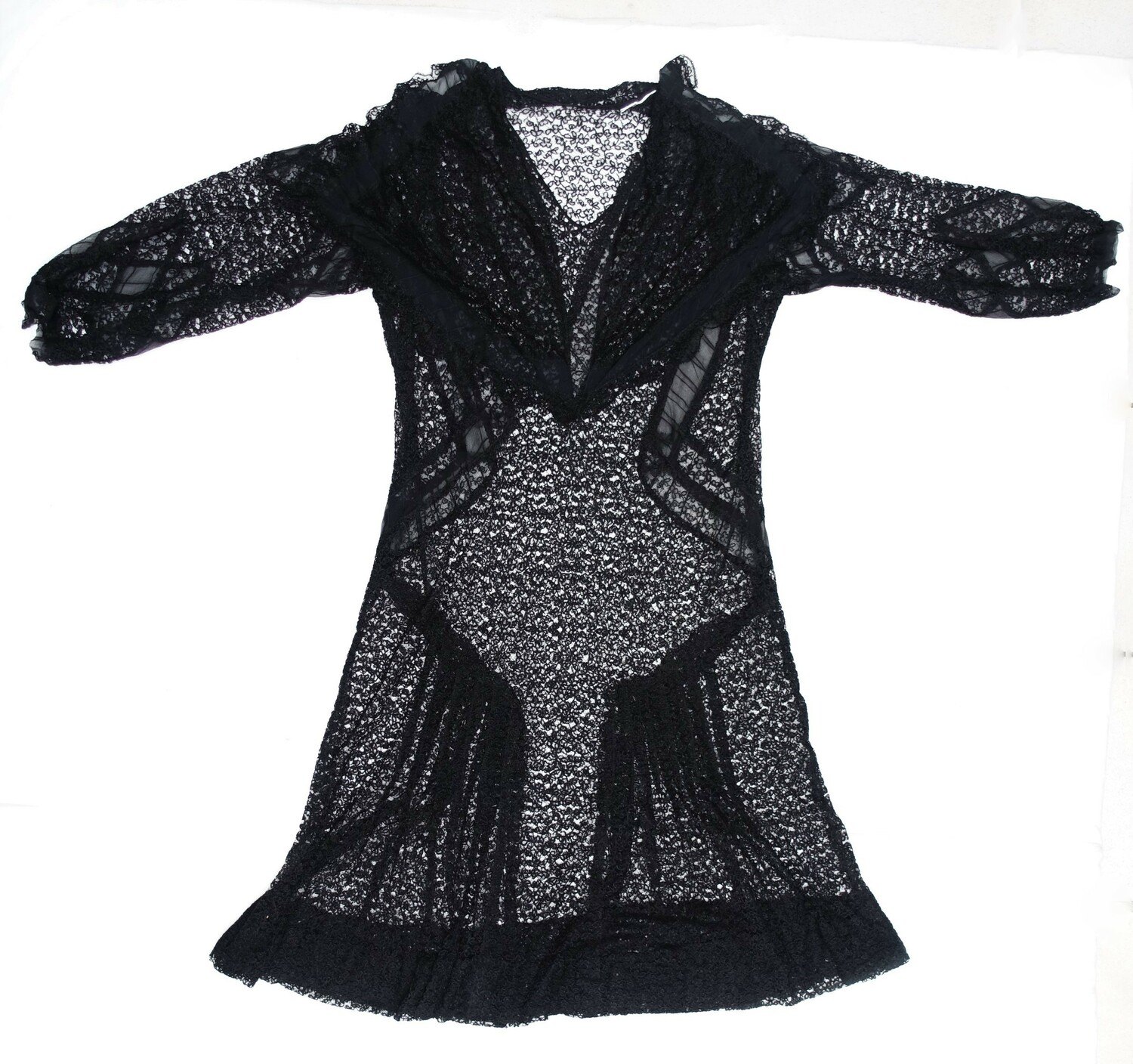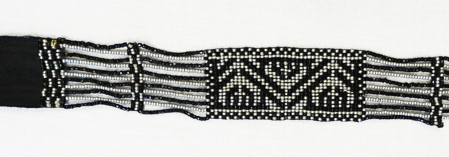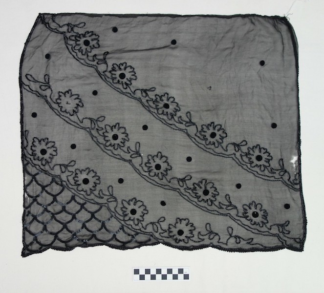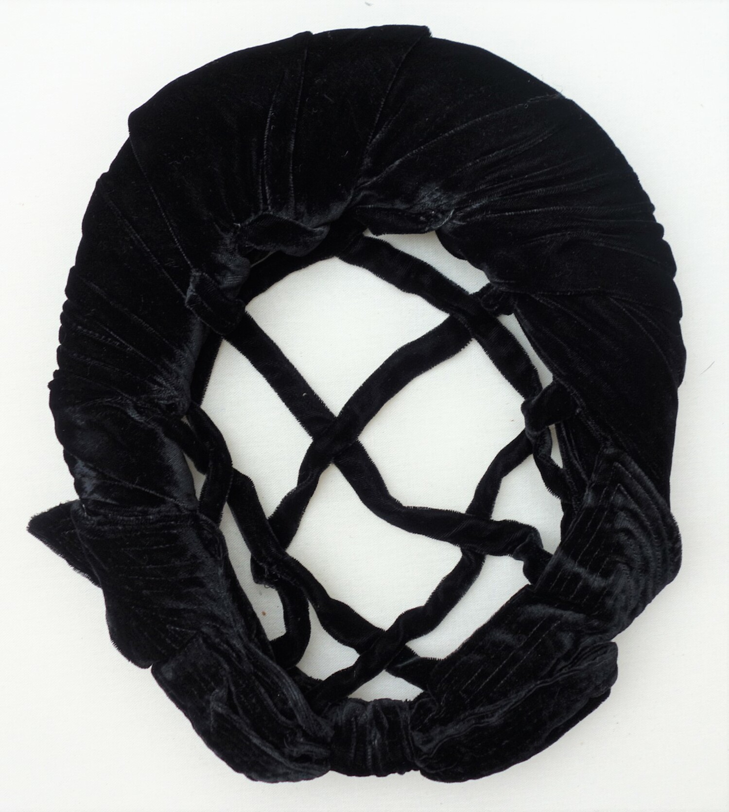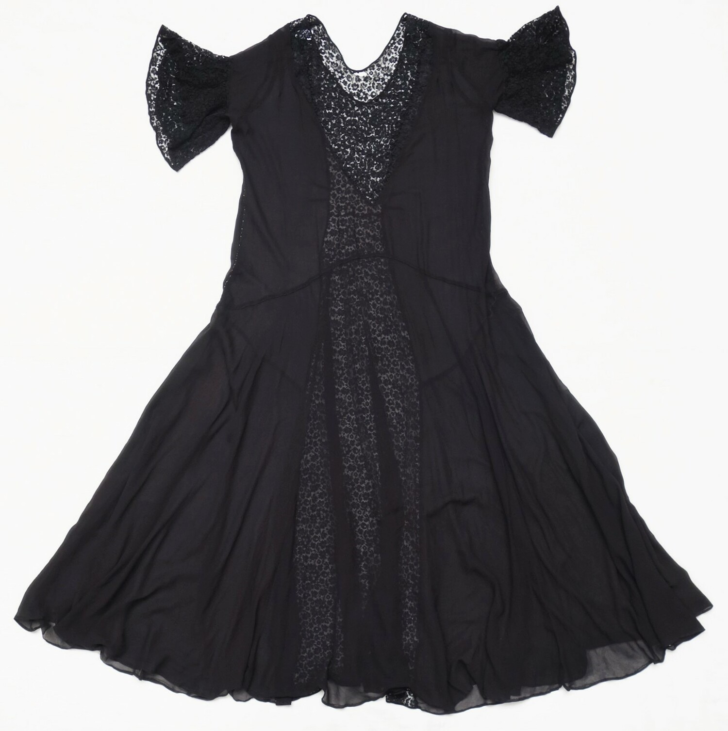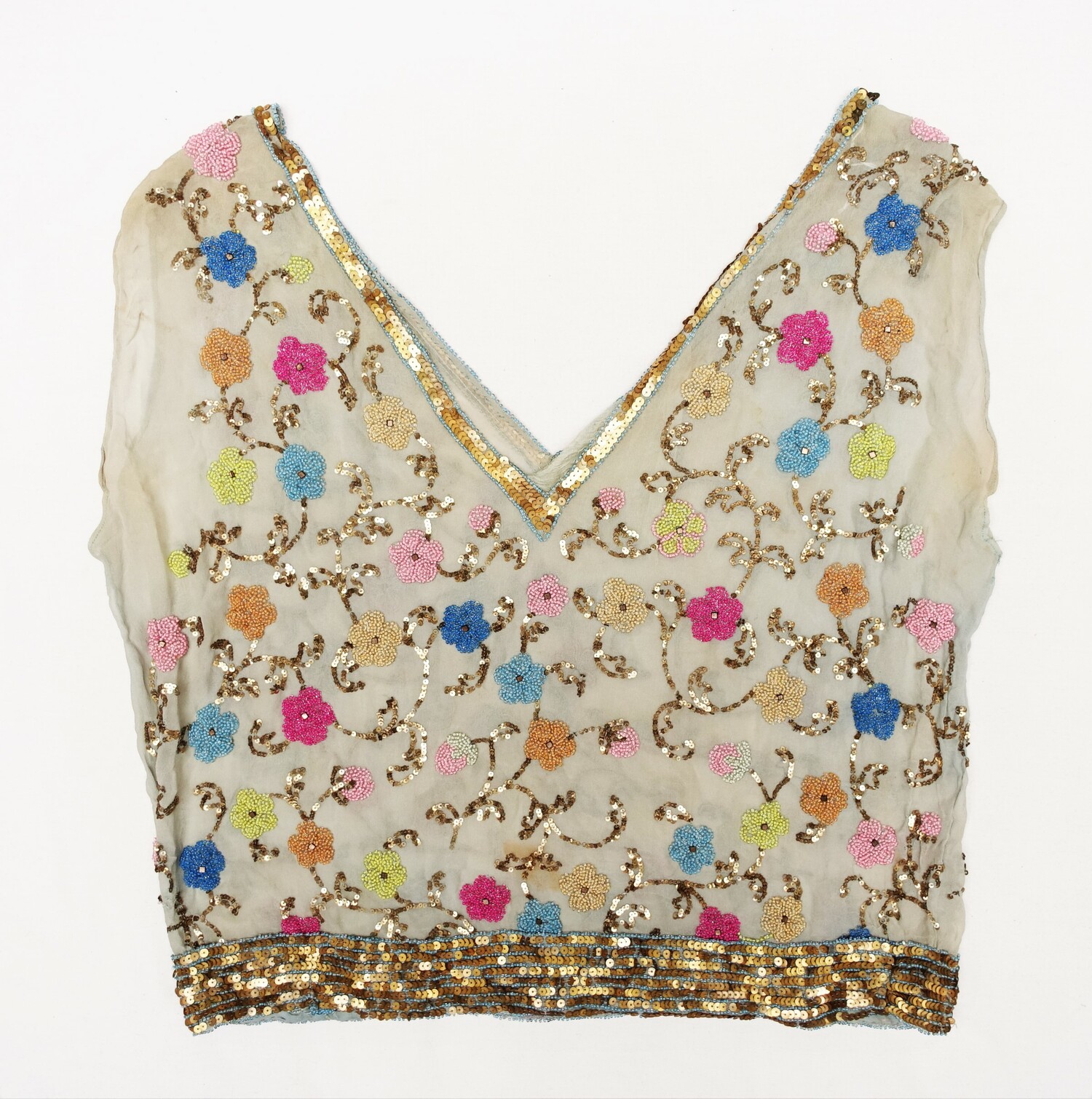 A woman's sleeveless dress in black chiffon that is decorated around the bodice area. The Netherlands, 1920s. TRC 2013.0075.As with daily wear, accessories were an absolute must, the obsession for day hats translated into elaborate beaded headbands, turbans, velvet/feathered hair pieces or even sequin tiaras. Long layered strings of beads of pearls and chokers were popular jewellery, and the look could be completed with a small evening bag or clutch.