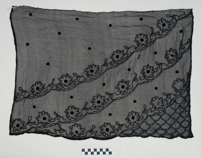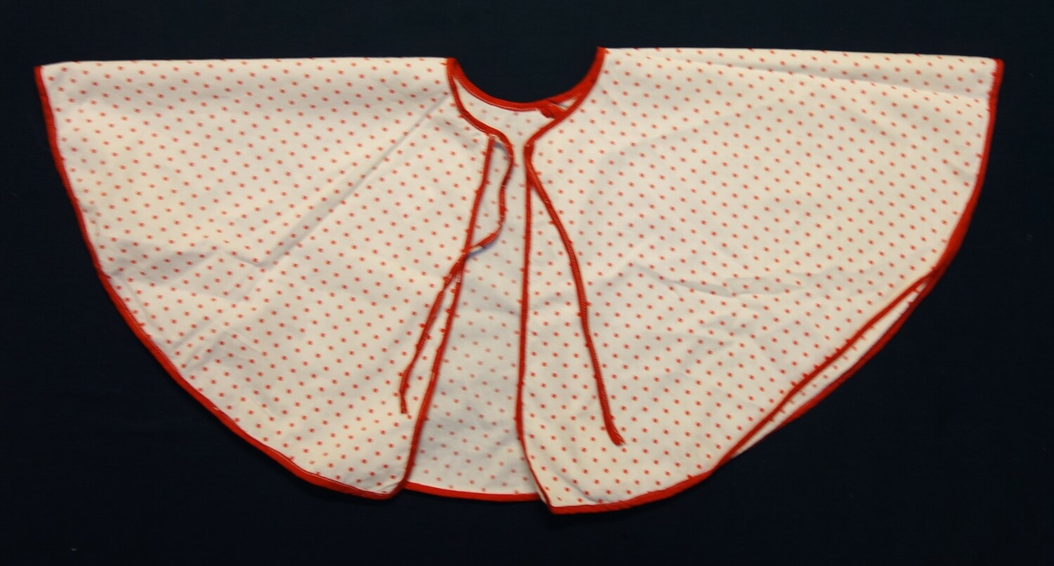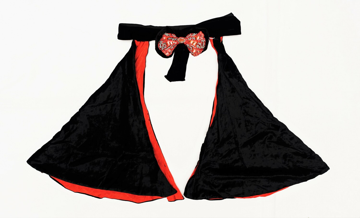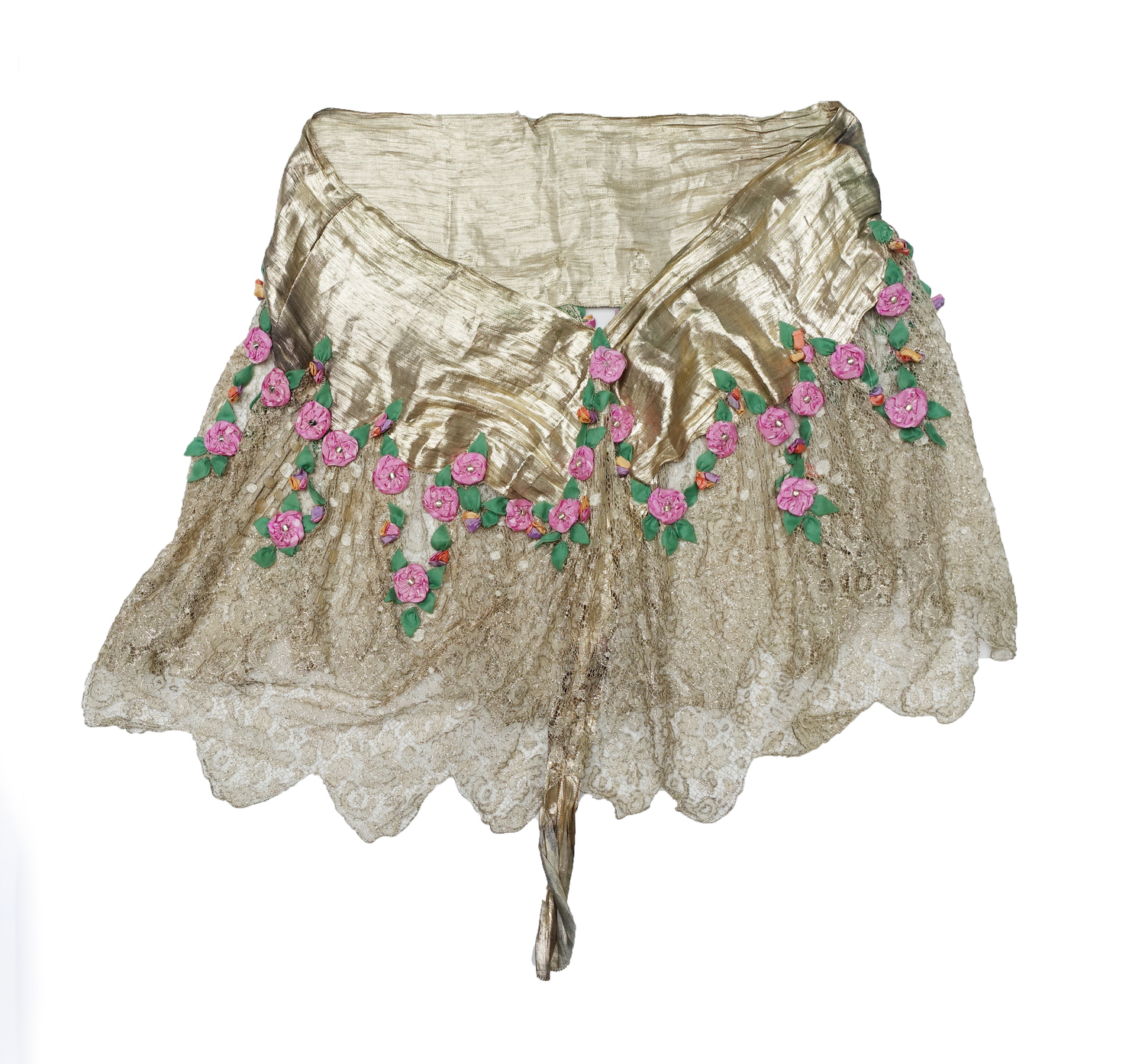 The exhibition inludes three stylised capes; an interesting thought is whether the black and orange cape’s decorative bow (TRC 2022.31782022.3178) would in fact have been worn on the back rather than the chest of the wearer since an open back would have been the fashion of the time.