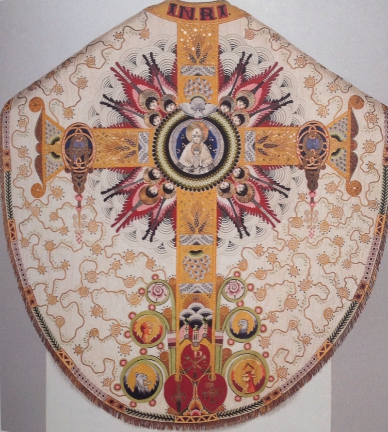 Another chasuble to be highlighted dates to 1922 and was donated to the Dom by the family of Theodor Wieschebrink. The chasuble was designed by Augustin Pacher, Munich. There is a cross with central medallion depicting Mary with Christ Child. They are surrounded by angels. At the base of the cross are medallions enclosing the emblems of the four evangelists (eagle, lion, bull, human head). The main designs are embroidered in multi-coloured silks, while the background is decorated with scrolls made from couched gold cord.