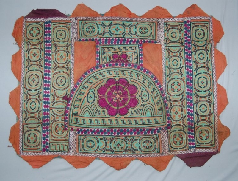 The saddle cloth is backed with a mid-blue cotton material. It is likely that the leather was first cut into strips, embroidered and then the strips were cut to the correct lengths to create the design required. The embroidery is carried out using satin stitch. The strips are decorated with a simple geometric and floral design worked in light blue, green, magenta and beige floss silk. Around one long edge of each stripe there is a band of circles in alternating magenta and dark blue. There are two large pockets (one semi-circular in shape) in the centre of the cloth that are embroidered with a floral motif.