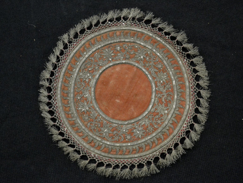 The mat is 30 cm in diameter. It is made of a velvet ground material with circles of flowers and leaves in applied silver thread and sequins, in between bands of flowers and leaves. The outer fringe is held in place with sequins and silver thread. The mat is backed with crimson silk.