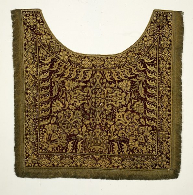 It was bought by the Museum (at the time called the South Kensington Museum) in 1864 as : "Saddle cloth of crimson Genoa velvet thickly embroidered with gold thread in conventional foliage pattern, &c. Indian, formerly the property of Tippoo Sahib. Received from Stores 15 July 1864. Received from Mrs Williamson. Price £30.00."