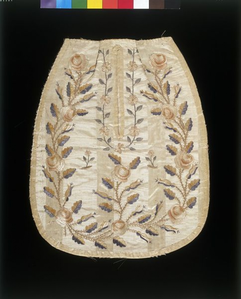 The collection of the Victoria and Albert Museum in London includes a pocket that dates to the early nineteenth century and was made in Russia. The ground material is made of linen and silk, sewn by hand with silk and linen, and embroidered with silk thread. It was acquired for the V&A in 1907, perhaps together with the towel end with bobbin lace.