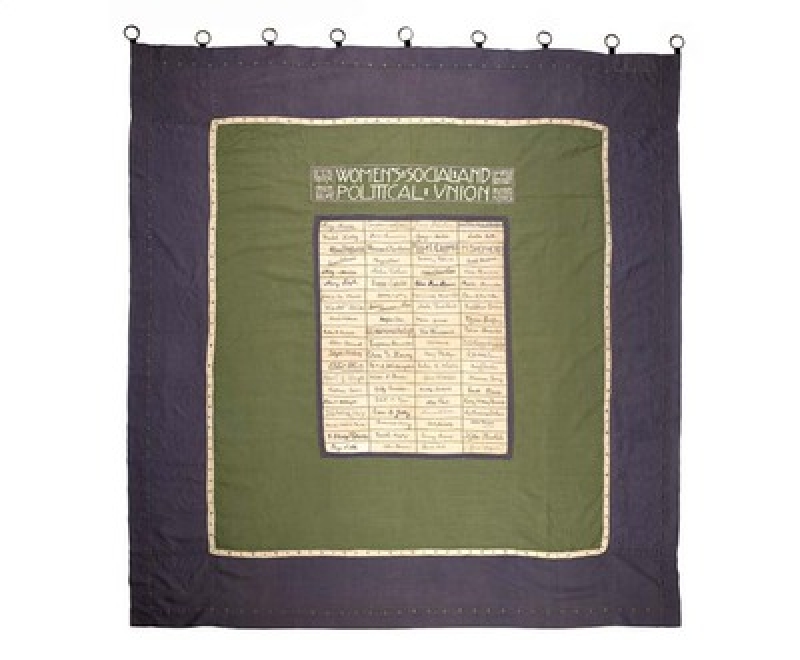 The banner consists of eighty pieces of white linen that are sewn together and bordered by bands in green and purple (the colours of the British suffragette movement). Each of the linen pieces was signed (whether the person who signed it was actually the bearer of that name is another matter) and then the signatures were embroidered in purple threads.