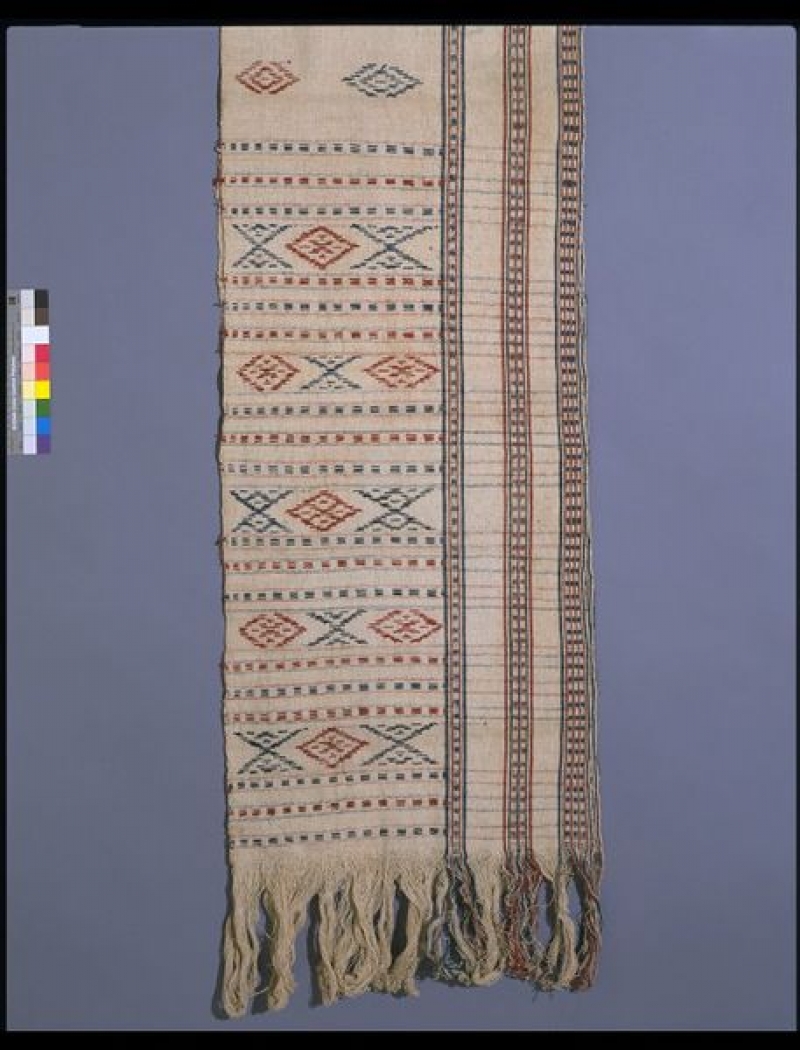 The Victoria and Albert Museum in London houses a lap cloth (localled called pangkheb) from Bhutan. It is made of unbleached cotton with woven and embroidered geometrical patterns in terracotta and indigo-coloured cotton threads. It is almost 2.5 m long. It dates to about 1900.