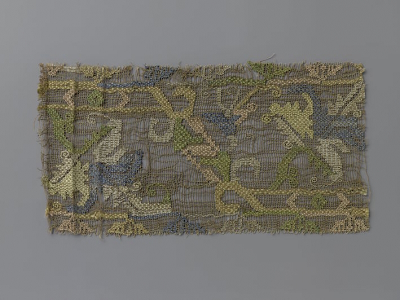 The Rijksmuseum in Amsterdam houses a small stroke of buratto embroidery that dates to the sixteenth century. It measures 26 x 13 cm. The floral motifs are darned in blue, green, yellow, beige and pink on a warp ground with an even-twined weft. The origin of the stroke is unknown.