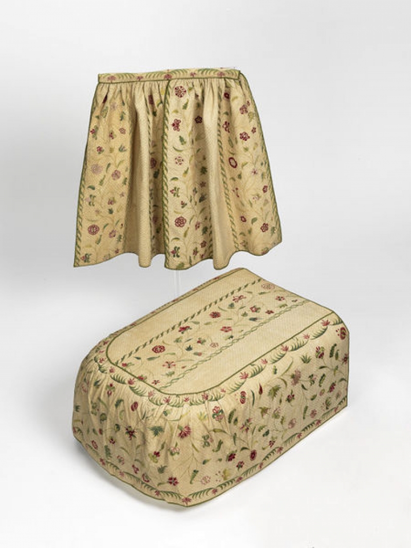 The floral patterns, worked in chain stitch, recall Indian textiles (chintzes), which were very popular in Europe in the late seventeenth and early eighteenth centuries.