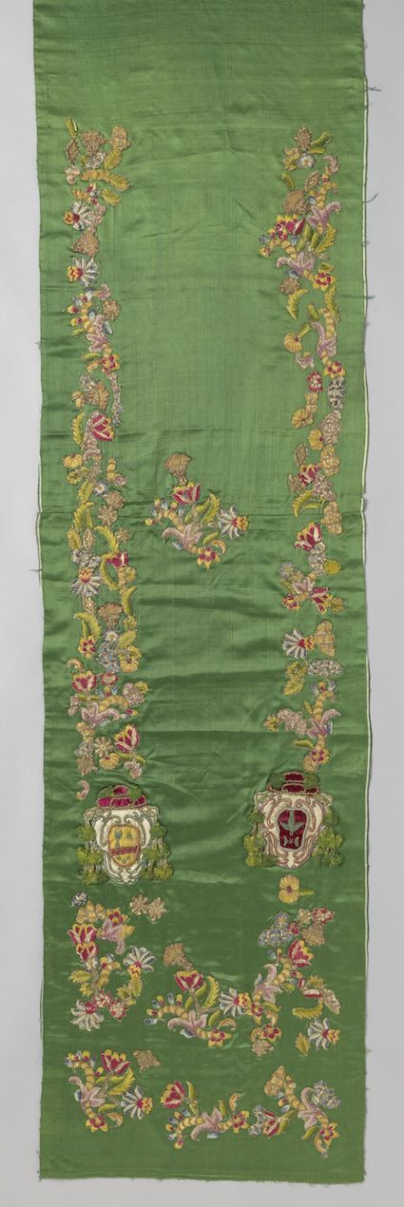 The Rijksmuseum in Amsterdam houses a long length of embroidered wall covering. Its ground material is made of green silk, and the decoration includes applied flower stems, which are embroidered with silk, silver and gold thread. The embroidered decoration includes two applied coats of arms of prelates, made of silk and velvet. Both of them are covered with a red hat (for a cardinal) and tassels.