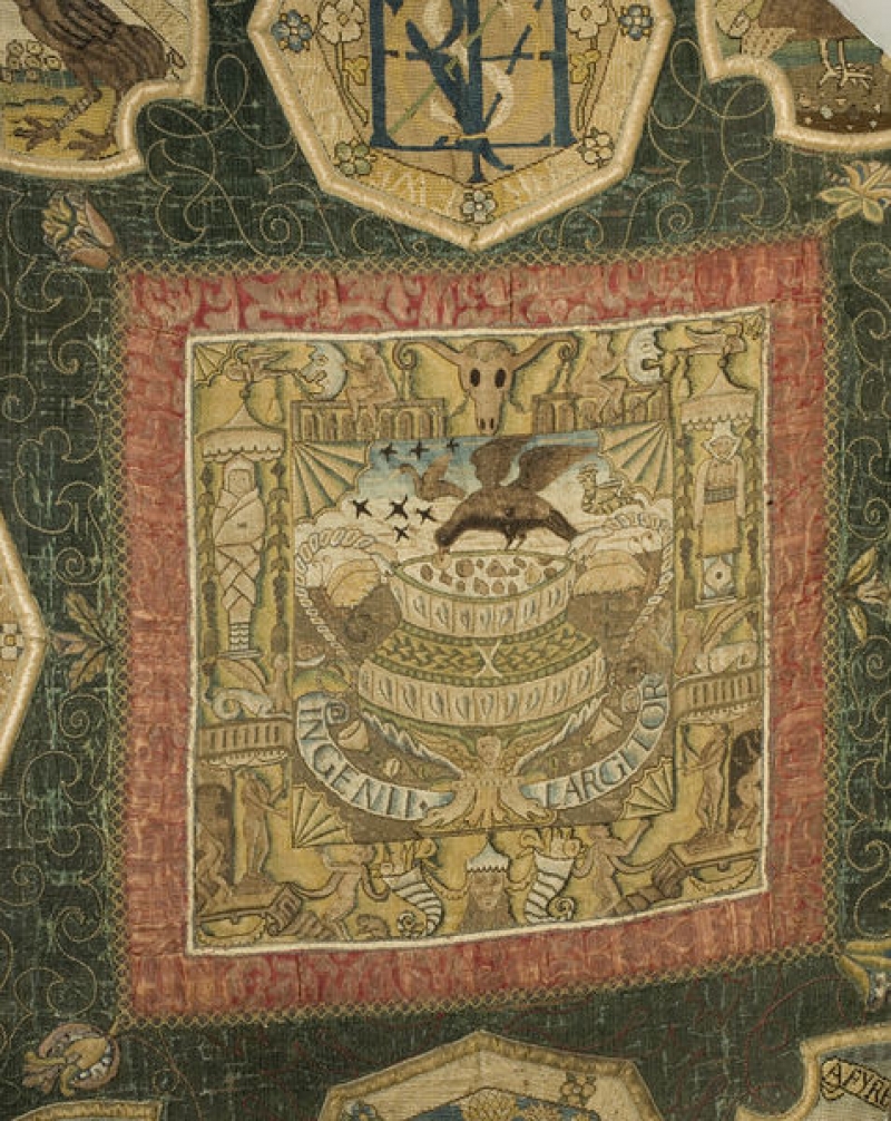 The slips often contain various symbolic and political messages (emblems), such as the catte embroidery that depicts a crowned ginger cat (Elizabeth I) playing with a mouse (Mary, Queen of Scots). Another slip is decorated with a phoenix, which was the symbol of Mary’s mother, Marie of Guise. The slips made by Mary have her monogram (letters MA, sometimes superimposed on the Greek letter phi), while those made by Bess have the initials ES. They are all made using a linen ground, with a design worked in tent stitch using floss silk. The emblem designs of the Oxburgh slips were probably devised at the request of Queen Mary and many were based on woodcut illustrations from contemporary botanical and natural history books, such as the Icones Animalium by Conrad Gesner (Zurich, 1553).