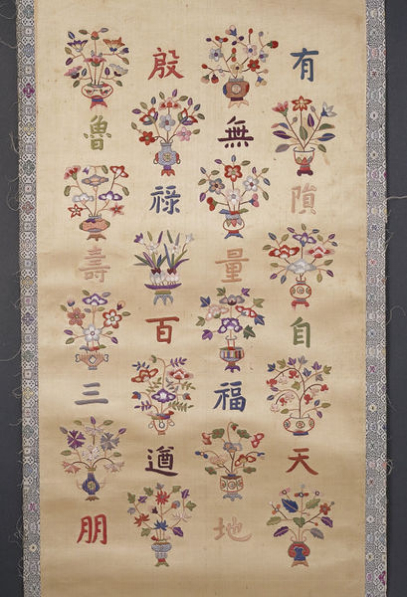 The Victoria and Albert Museum in London houses a screen panel from Korea that dates to the nineteenth century. It is made of silk, with silk thread embroidery. The screen measures 59.2 x 32.2 cm. It forms part of a set of four. The decoration is formed by columns of flower arrangements, interspersed with Chinese characters, expressing long life and happiness.