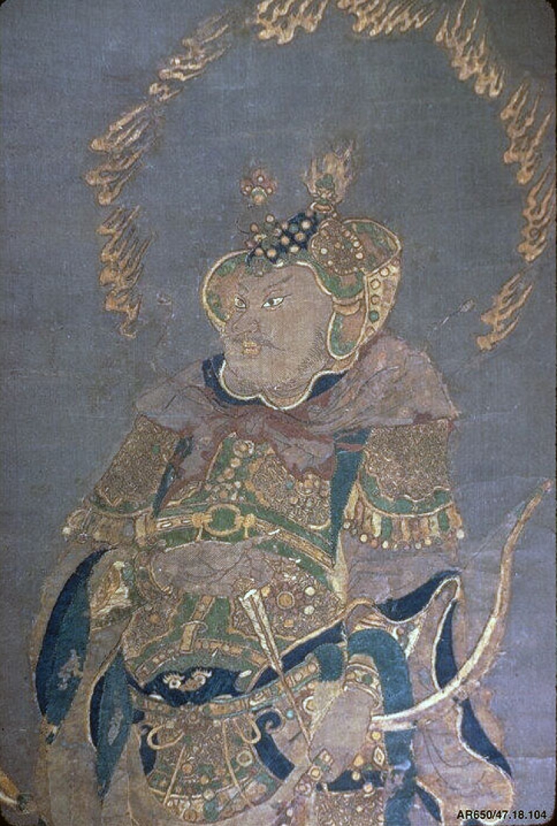 The scroll shows one of the Buddhist guardian kings of the four cardinal directions. He is holding a bow and arrow. The arrow would suggest the Guardian of the East, although the accompanying text identifies him as the Guardian of the West.