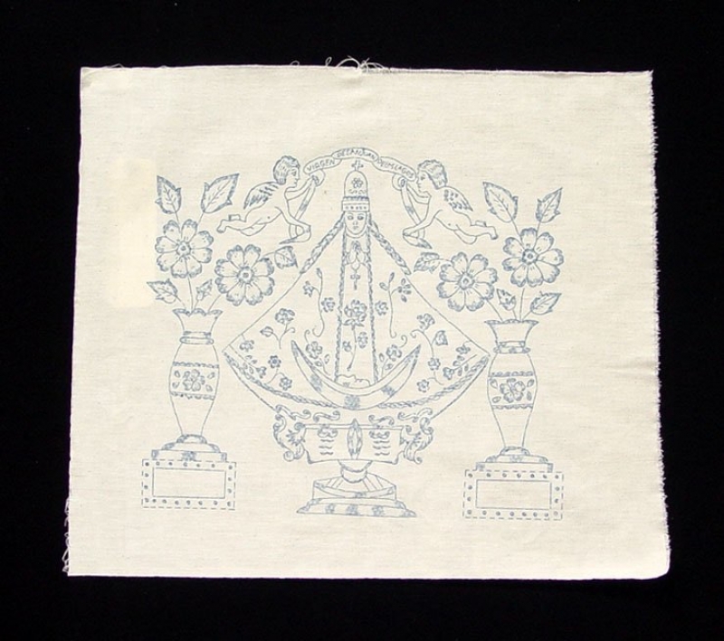 The design is printed in blue ink and shows the Virgin Mary wearing a wide cape and a tall hat. She is also shown standing on a pedestal that is flanked by two vases of flowers. Over her head are two angels holding a banner over the Virgin’s head that reads: “VIRGEN DE SAN JUAN DE LOS LAGOS.”