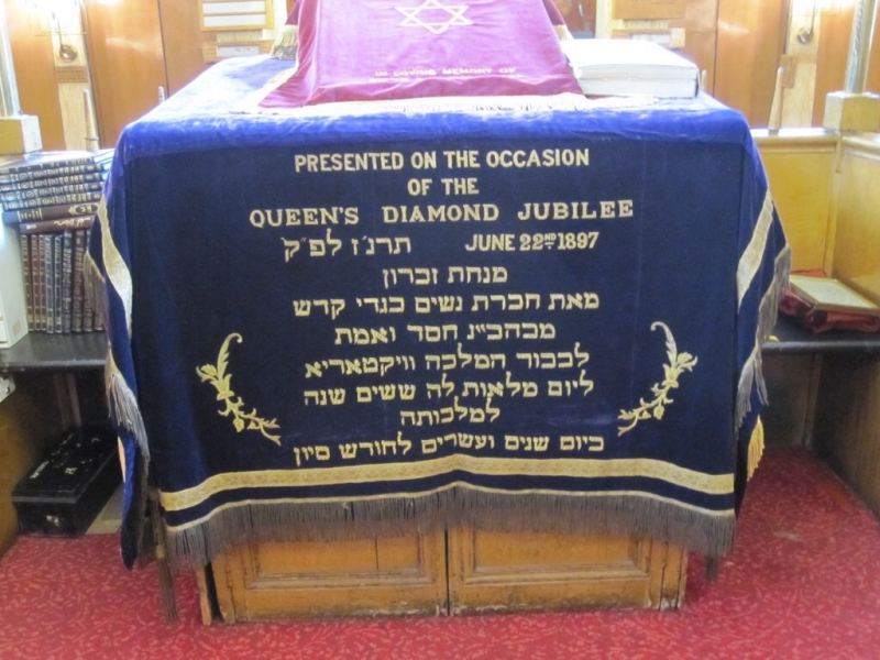 This particular bimah cover was made to celebrate the Diamond Jubilee (60 years) in 1897 of the reign of Queen Victoria of Great Britain (r. 1837-1901). It is made of purple velvet and embellished with silk gold thread embroidery. The embroidered text is in English and Hebrew.