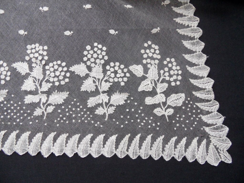The veil is made from an hexagonal net and measures c. 125 x 120 cm. The embroidery is worked in a white cotton thread using running stitch and satin stitch. It is decorated with a stylised floral motif of plants along one edge. In the centre are small, scattered flowers, and along the three other edges is an applied border made up of leaves.