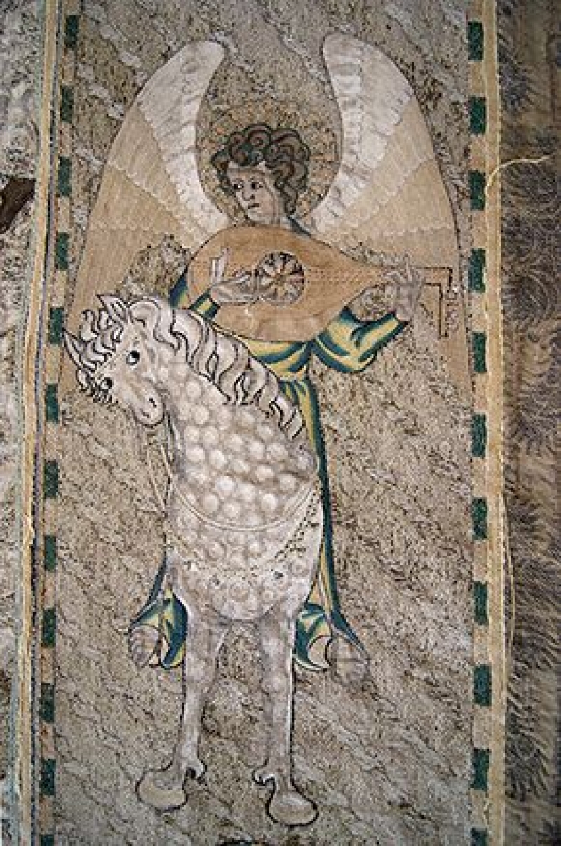 Many fragments of the original cope have survived, including parts of the orphrey, which is the decorative band going down the front opening of a cope. The surviving orphrey pieces include an angel playing a viola, a winged angel strumming a lute while riding a horse, a Moor hitting St. Barnabas on the head with a large club, a saint being stabbed to death, St Catherine, as well as various lions.