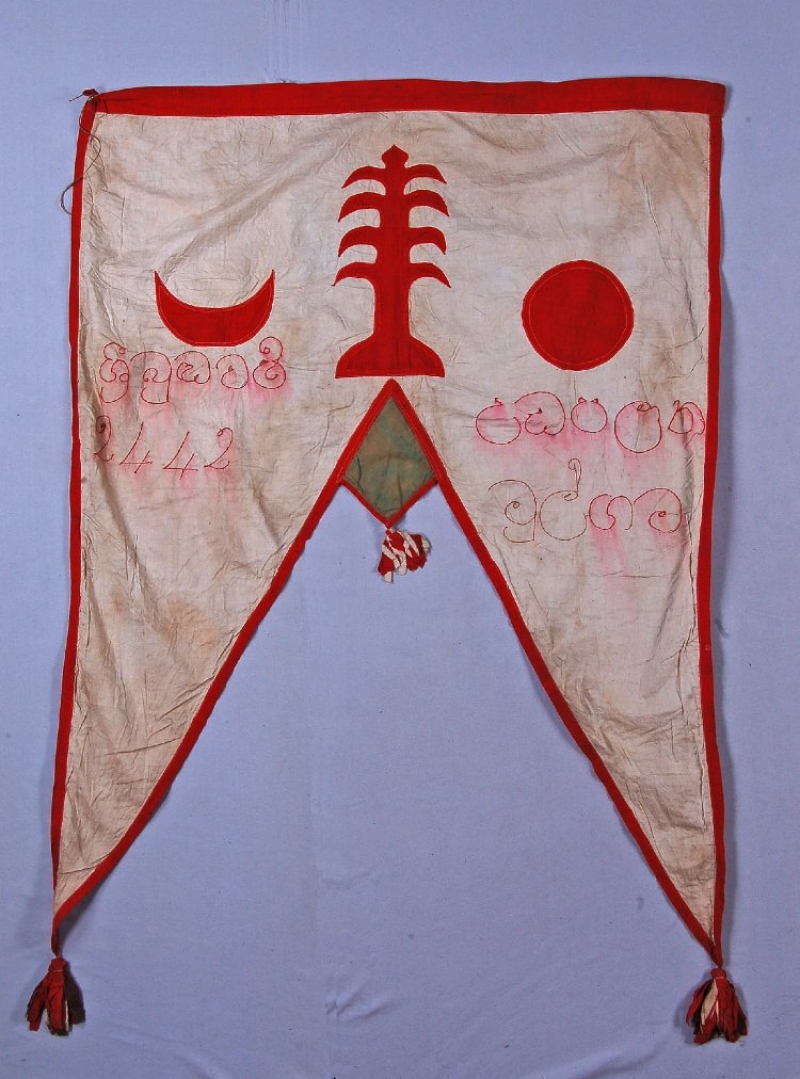 The Nicobar Islands are not famous for their embroideries, but they do have a series of banners (or flags) that are usually made from white cotton, with appliqué and embroidered designs. There are several examples of these flags in the British Museum, London, including one (acc. no. As2004,Q.9), which has an appliqué tree, crescent moon and sun, all worked in red cloth, as well as letters (either Nicobarese or Oriya script) worked in a chain stitch, again using a red coloured thread. At the ends of the two points of the flag are small cloth tassels. It is 160 x 110 cm in size.
