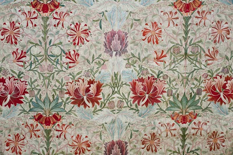 The Day Dream, by Dante Gabriel Rossetti, 1880. The model is Jane Morris. The painting is housed in the Victoria and Albert Museum, London, acc. no. CAI.3 (online catalogue; retrieved 30 January 2017). This is the last painting completed by Rossetti. Jane is holding a sprig of honeysuckle, which may have symbolised her romantic affair with the painter. The title of the painting is also that of one of Rossetti's poems, which ends with the words: She dreams; till now on her forgotten book / Drops the forgotten blossom from her hand