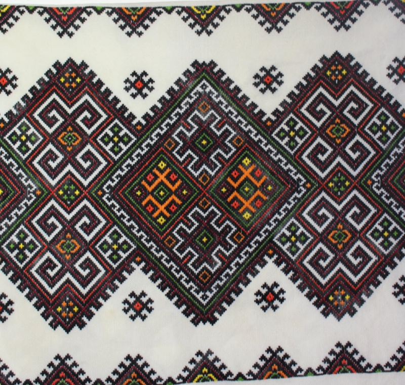 Nyzynka work differs from Nyz' embroidery in the fact that, while the outlines of the motifs are worked in black using a simple darning stitch (as with Nyz' embroidery), the motifs are subsequently filled in with another colour (traditionally in yellow, orange, green or red).