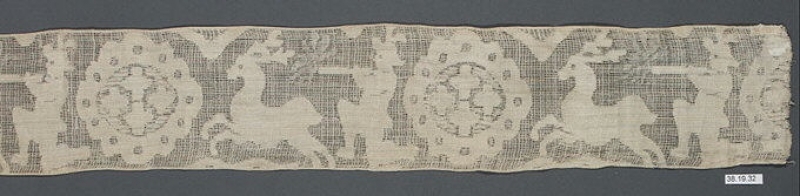 Opus teutonicum has been produced since at least the twelfth century AD. It was usually worked on a linen ground using a white linen thread, although sometimes white wool was used. There are two main forms of opus teutonicum, one is worked on a plain weave ground, the other on a net-like ground using a drawn thread technique. The first type sometimes used coloured wool or silk threads to highlight certain features. By the second half of the thirteenth century the use of coloured silks started to increase. This form of opus teutonicum uses a range of stitches, including chain stitch, gobelin stitch, long aand short stitch,satin stitch and stem stitch. This type is particularly associated with Kloster Lüne (northern Germany).