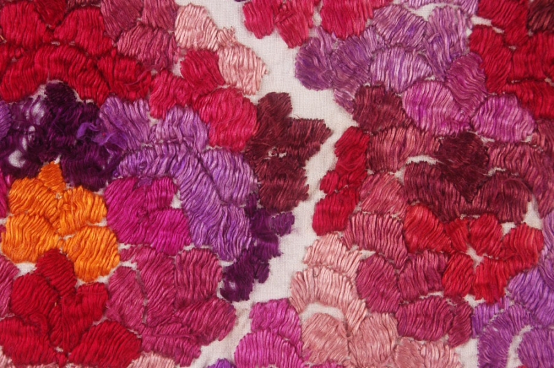 New Rabat embroideries: The above styles went out of fashion from the mid-nineteenth century onwards and a new form was adopted. This is characterised by profuse, dense, multi-coloured designs using strong contrasting colours. In addition, more and more of the ground cloth (an open weave material of either cotton or linen) was covered with stitching. At the same time there was a move to a greater use of back stitch, feather stitch, running stitch and satin stitch. These changes in technique and appearance were more suitable for the decoration of larger items, such as the famous Rabat door curtains. Sometimes New Rabat embroidery is worked on tulle or bobbinet decorated with both satin stitch embroidery in silk and, with a hook, chain stitch (tambour embroidery) and a thick cotton thread. The tambour work was used to create simple floral and geometric patterns. This form of embroidery was often used for soft furnishings such as bed curtains.