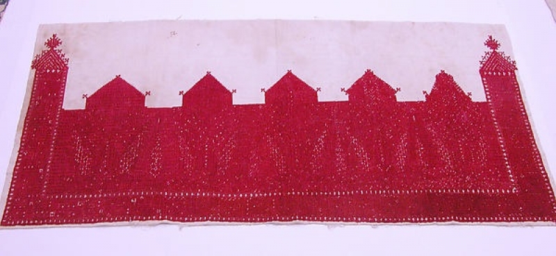 Salé embroidered door hangings or curtains had a soft, velvety appearance and were again worked in bouclé stitch. These curtains were made in three vertical stripes, which were separately embroidered and then sewn together to form a width of about 200 cm. These were usually worked in either navy blue or brick red floss silk. The embroidery covers much of the lower part of the curtains: to a depth of between 30 and 40 cm. At the edges and where the stripes are sewn together there are often minaret-like decorations called tala. They can rise 50 cm or more above the main, embroidered border.