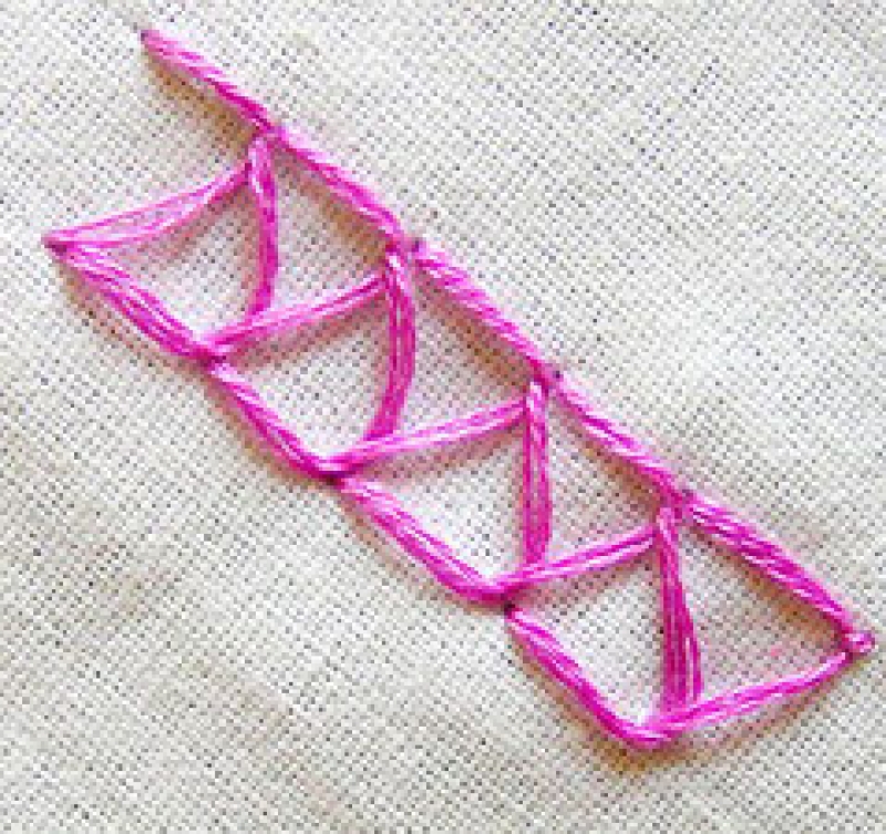 It is worked as a feather stitch, but the needle is pushed through the ground material in a vertical way, rather than at an angle, as with the 'normal' feather stitch. The loops are also stitched more closely together.