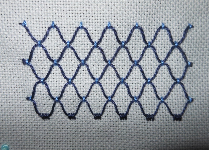 One colour is used for small, evenly spaced and vertical stitches worked along regular lines. The second thread is used for weaving through opposing stitches along the first and second horizontal lines of stitches, without piercing the ground material. By weaving the second thread again through the second and third line of stitches, a trellis work pattern is created.