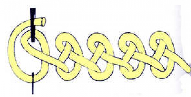The Gordion knot stitch is a form of twisted chain stitch, which is worked between two imaginary horizontal lines, whereby the first twisted stitch is worked from the bottom to the top line, and the second stitch, to the left, from the top to the bottom line.