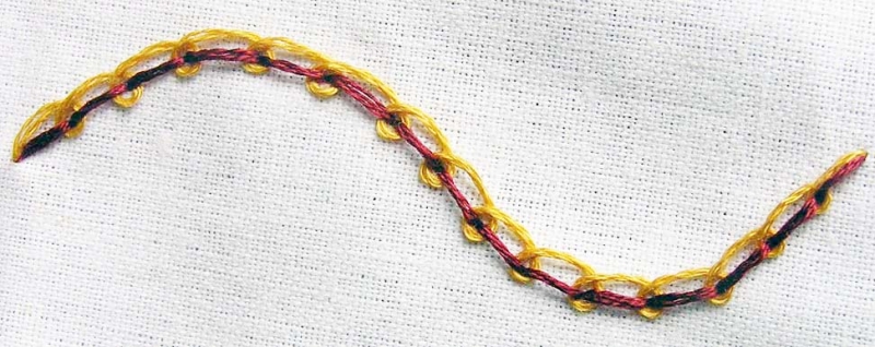Firstly a line of long and fairly loose back stitches are worked on the ground material. Then, using a blunt needle, a second thread is laced through the back stitches, going forward two and then back one in order to form a series of small loops. The finished appearance depends upon the size of the loops and the type of threads.