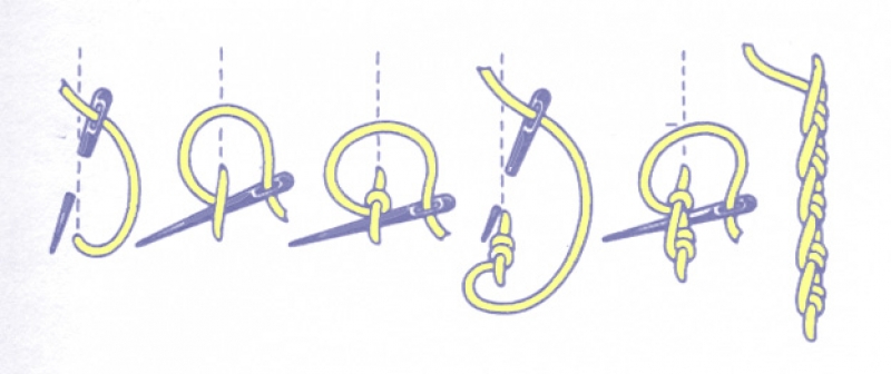 The Portuguese knotted stem stitch is a whipped stitch, which is created by working a stem stitch the thread twice. and then bringing up the needle at the centre, to one side, and whipping the thread twice. After the second stem stitch has been made, both stem stitches are whipped twice. After the third stem stitch has been made, the second and third stem stitch are whipped twice, etc.