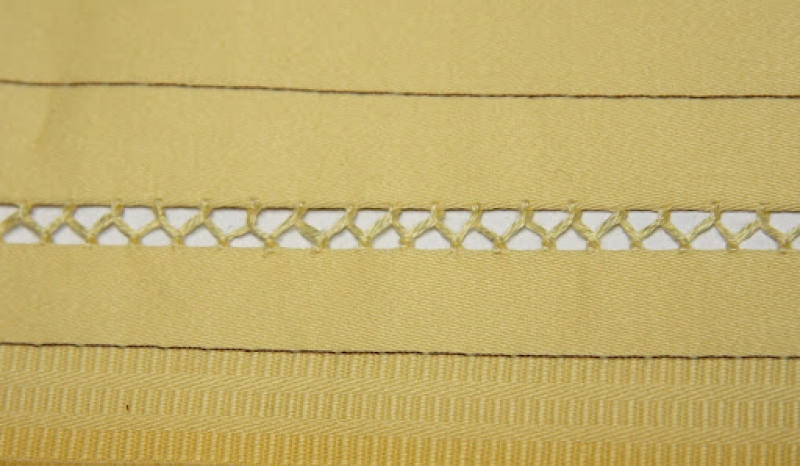 Faggoting is a technique of sewing two hemmed pieces of textile together with (decorative) stitching, creating a zigzag pattern, but leaving a narrow gap in between. Also known as twisted insertion stitch. It was particularly used in the nineteenth century for ladies' underwear.