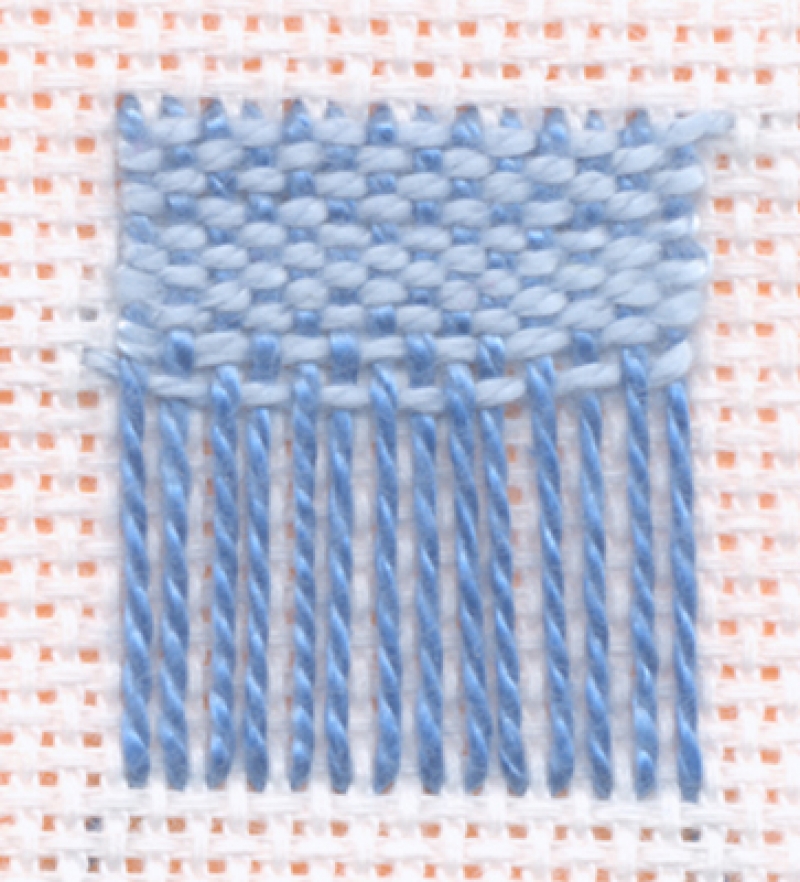 Surface darning is a technique that creates a densely woven surface on a plain and even-weave fabric. First a layer of surface satin stitches is worked, after which a second thread is woven in and out of the satin stitches. The second thread should only contact the ground material along the edges.