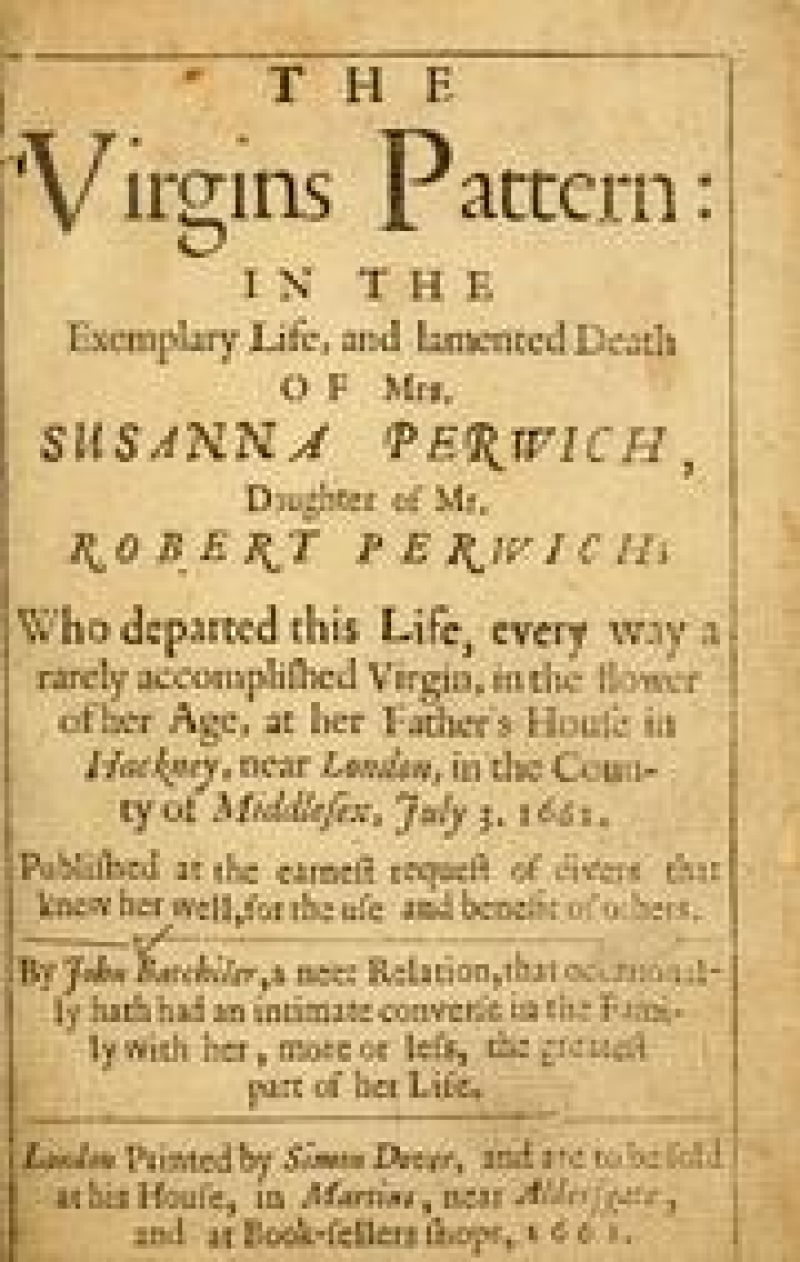 The Virgins Pattern: in the exemplary life, and lamented death of Mrs. Susanna Perwich .... is a mid-seventeenth century printed eulogy about the life and death of Susanna Perwich (1636-1661), a Quaker from London. She was the daughter of Robert Perwich of Aldermanbury, London.