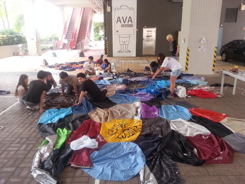 The ‘Umbrella Patchwork’ was made from more than 250 discarded and broken umbrella awnings (the cloth used to cover the umbrella frame). It was made by a group of about fifty students at the Academy of Visual Arts, Hong Kong Baptist University. It took three days and nights to make and was about 10 x 10 m in size. It was temporarily suspended from two footbridges in Admiralty, Hong Kong in order to provide shelter to protesters. The students regarded the Umbrella Patchwork as symbolising the unity and good wishes of Hong Kong people in their peaceful fight for democracy.