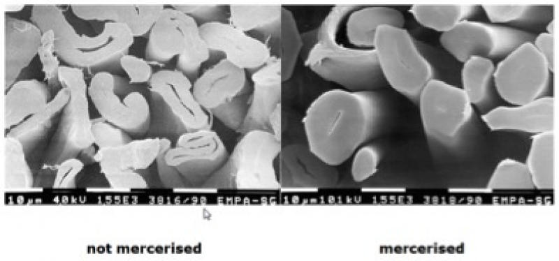 The initial process was developed in 1844 by John Mercer (Lancashire, England), who treated cotton fibres with sodium hydroxide, but without neutralising the alkaline with acid. This treatment caused the fibres to swell, making them stronger and easier to dye, but at the same time they shrank making it difficult to spin the fibres into a thread.