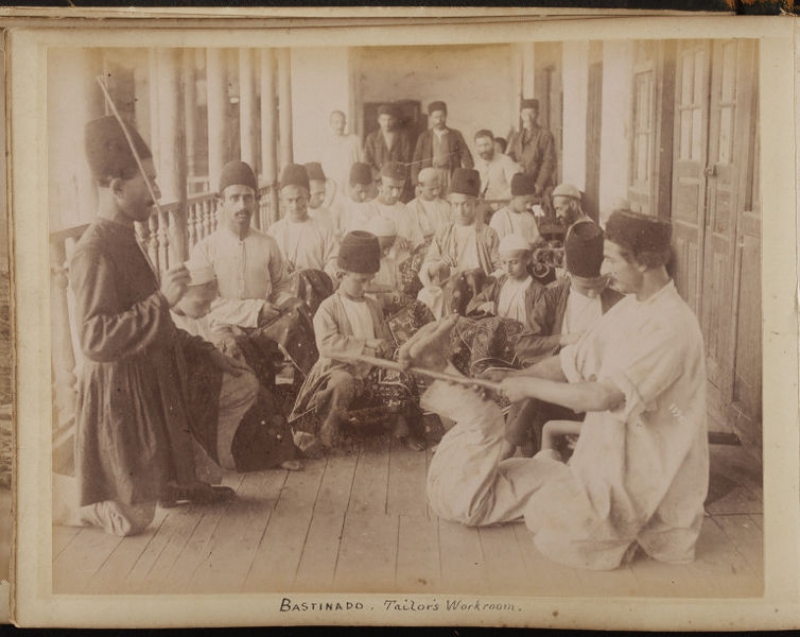 The albumen print carries the caption 'Bastinado. Tailor's Workroom'. Secondary documentation tells that the photograph was taken in Rasht, northern Iran. Rasht was the centre of embroidered felt patchwork, rashti-duzi.