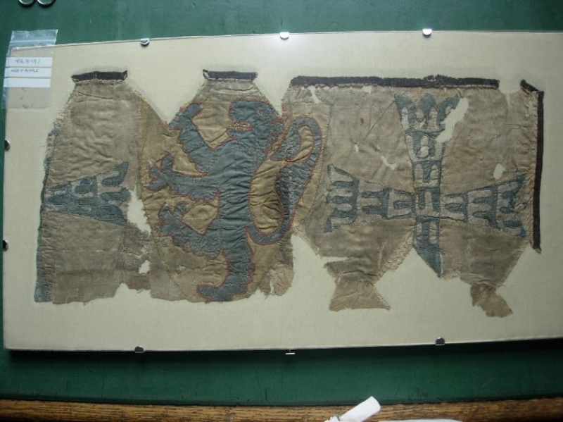 At some point the cloth was cut down to make a Great Seal bag. The Great Seal of England (later known as the Great Seal of the United Kingdom, or Great Seal of the Realm) was a double sided wax seal used to symbolise a king or queen's approval of state documents. To make the seal, wax is melted into a silver mould (matrix) and thus a double-sided wax seal is made with the figure and inscription of the matrix. The seal was then attached by a cord or ribbon to a document in order to make it official. A bag was used to cover and protect the wax seal hanging from the bottom of a document.