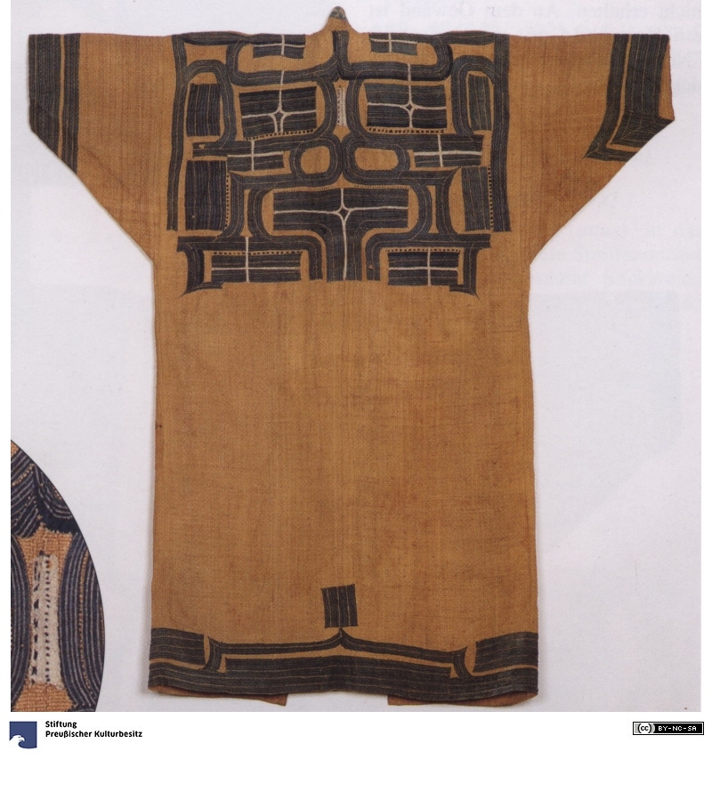 The Ethnologisches Museum in Berlin houses a bast fibre tunic from among the Ainu in Hokkaido, Japan. It dates to the second half of the nineteenth century, or earlier, and was acquired by Max August Scipio von Brandt (1835-1920). The fabric is made of the bast of the Atsui tree. The tunic measures 123 x 115.6 cm. The embroidery is worked with cotton.