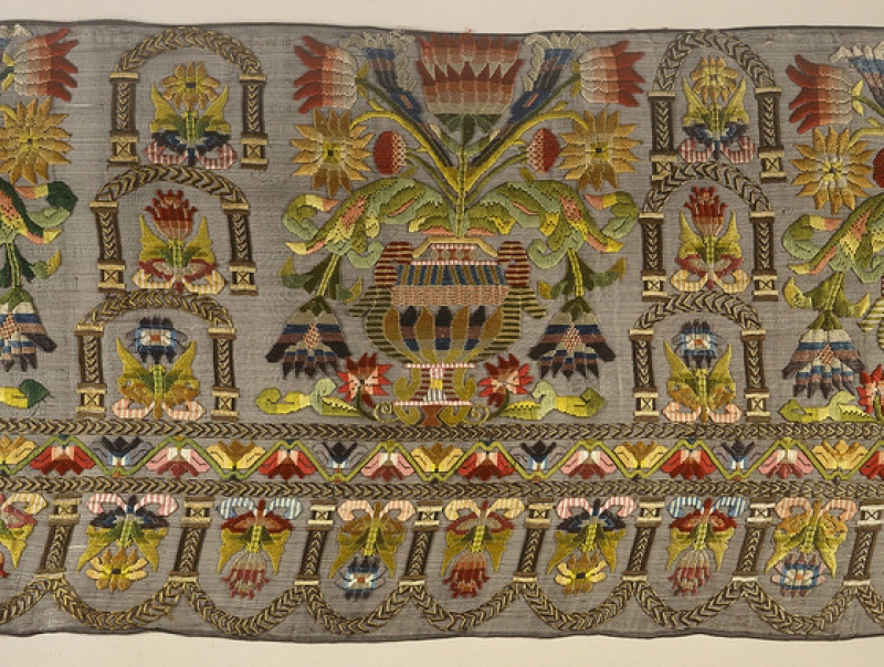 The Los Angeles County Museum of Art houses a long length of buratto embroidery from Italy, dating to the seventeenth century. It measures 5.46 x 0.6 m. It is made of silk embroidery upon a linen net. Buratto embroidery was often used as a border trim (hence the long length of this piece). The vase-and-niche motif and the bright colours recall Turkish influences.