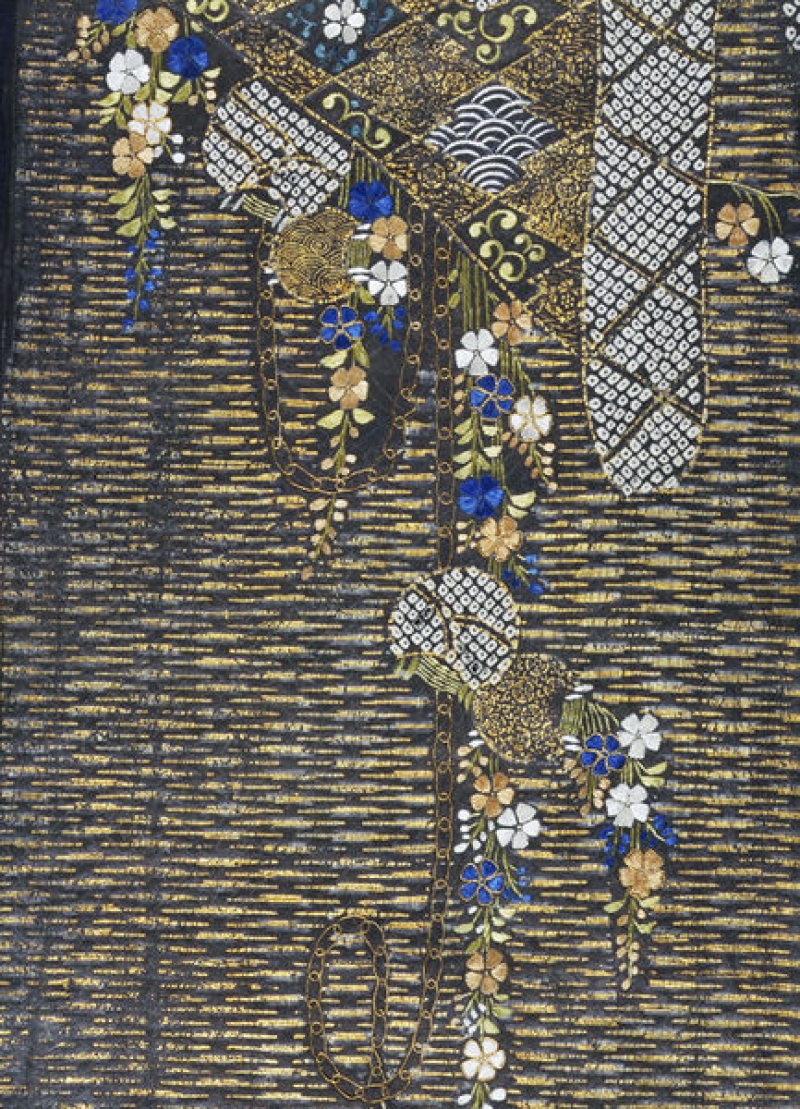 The Victoria and Albert Museum, London, houses a small fragment of a kimono that dates to the late sixteenth or early seventeenth centuries. It is made of monochrome figured satin silk (rinzu) with applied gold leaf decoration (surihaku, tie-dyeing (kanoko shibori) and embroidery with silk and metal threads. The fragment measures 58.5 x 30 cm.