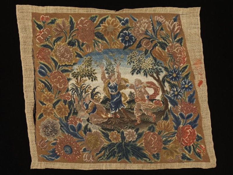 The central scene represents a nymph being chased by Apollo. The chair seat appears never to have been used. It was donated to the V&A together with other furniture covers. A letter added to the donation by the donor's nephew tells about the background of the furnishings: “They were worked by the first Lady King and her ladies. She was the wife of Peter Ist Baron King, who was Lord Chancellor from 1725 to 1733. His mother was the sister of John Locke the philosopher.”